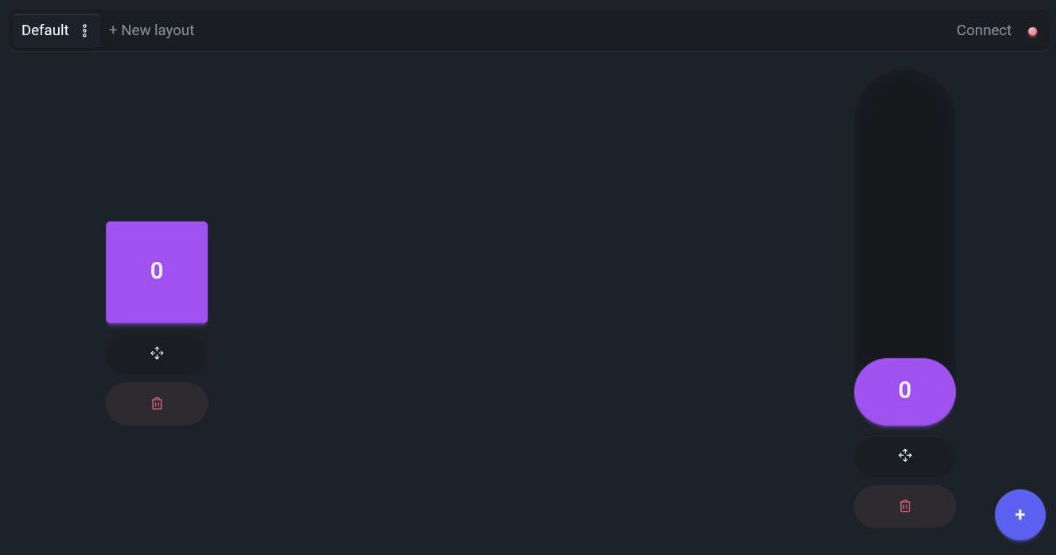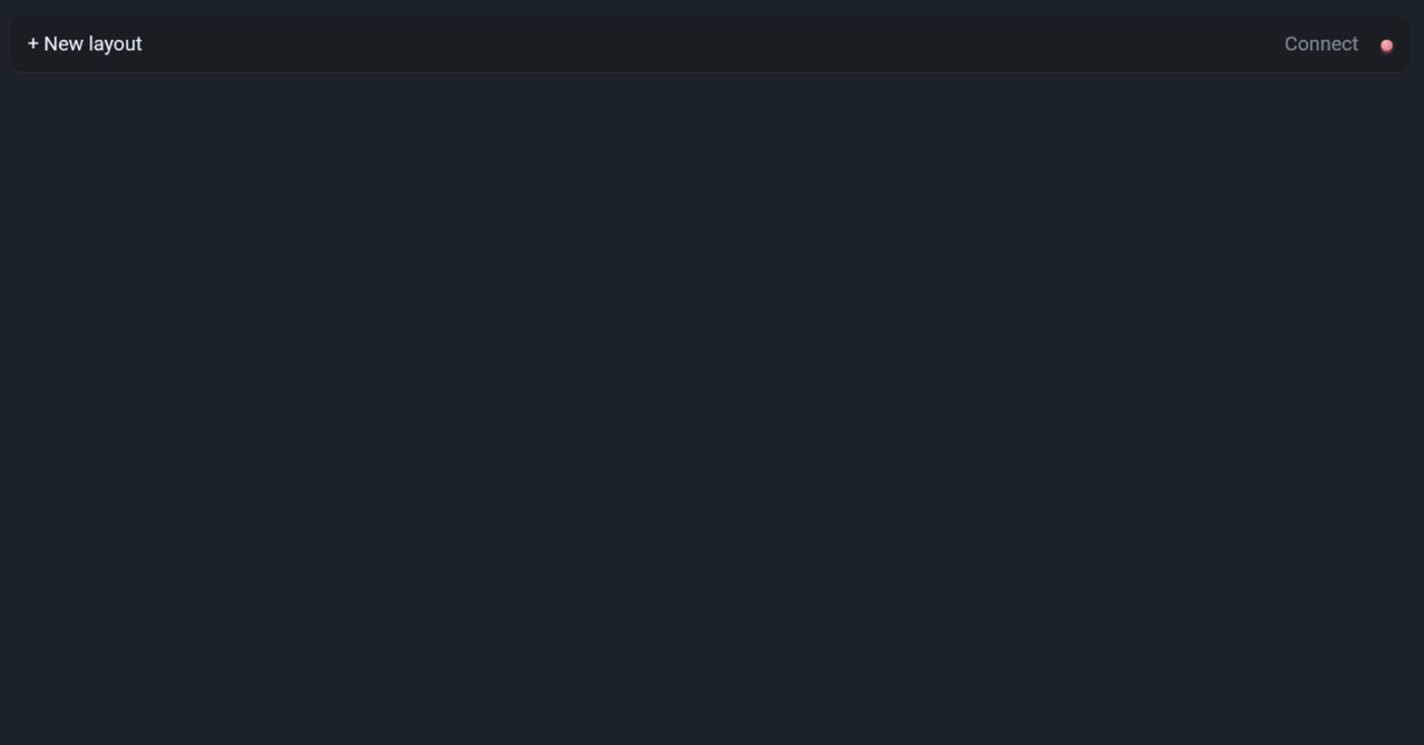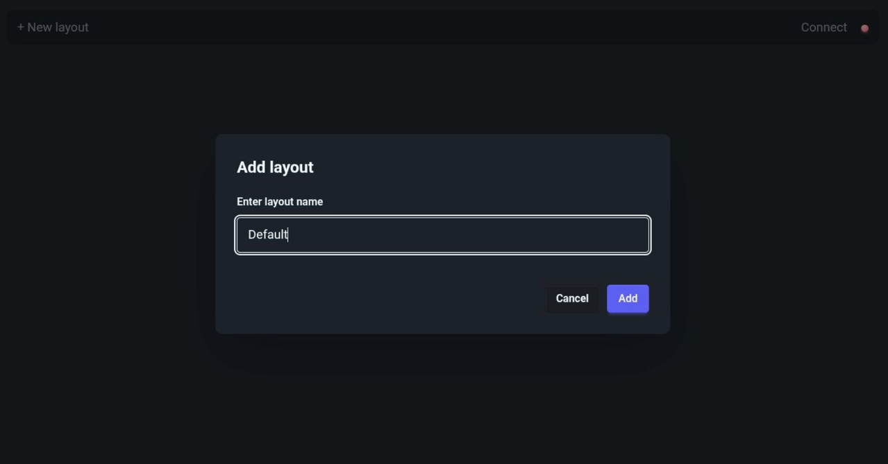 Now you can create your first controller layout. To do so you can click the + New layout button in the top left. You can give it any name; for this guide we will just call it Default. Once created, if not already active, you can select the created layout from the top left to activate it, after which you will see a + button appear in the bottom right