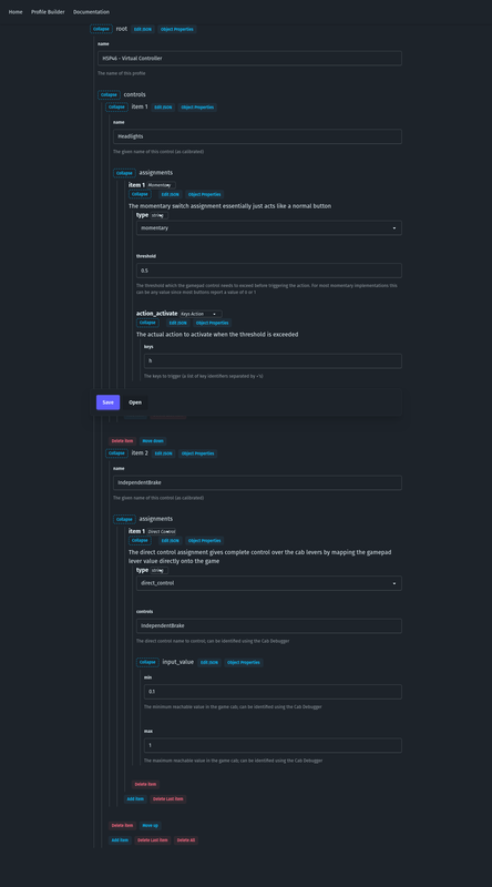 I won't go in-depth into setting up profiles in general but generally the controls on the virtual controller act exactly the same as any normal calibrated controller. The names given to the controls on the device act the same as they names you give the controls when calibrating a joystick or gamepad. This means we can simply add an assignment for the Headlights control to trigger the h key and add an additional assignment for the IndependentBrake to use direct_control to control the independent brake (we will be using the HSP46 as an example where the name of the in-cab independent brake is simply called IndependentBrake). The result will look something like this in the profile builder: