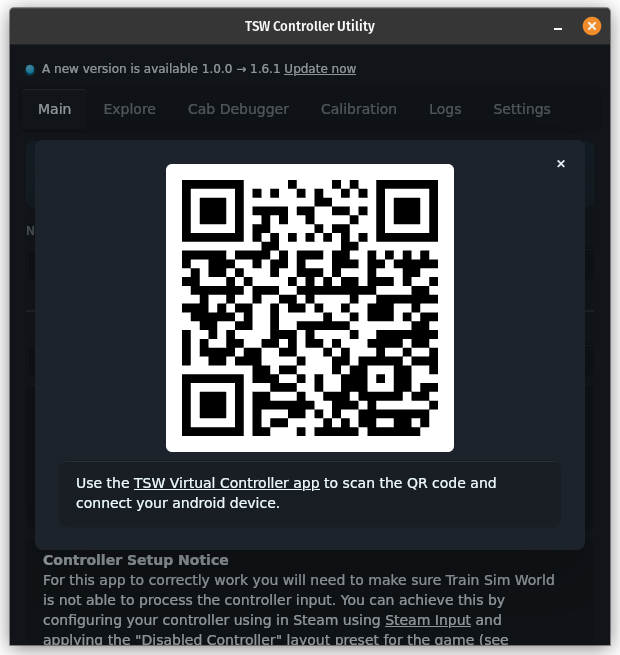 Now we have both the profile and virtual controller configured we can connect the device to the app. Go ahead and open the TSW Controller Utility on your computer and you will see a new button titled + Connect Virtual/Remote Controller. When you click this button a dialog will appear with a QR code which you can scan from the remote device using the Connect action in the top right. This will trigger the camera to open in order to scan the QR code to establish a connection. Once scanned the status bubble in the top right of the remote device should change to green signifying the device is connected and the controller should appear in your controller list.